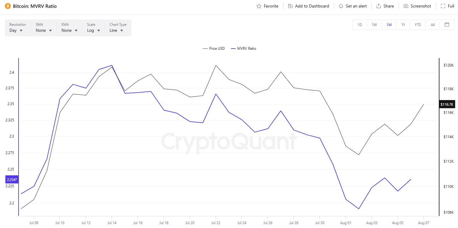 Au cours du dernier mois, le ratio a fluctué dans la plage saine de 2,2 à 2,4, ce qui indique qu’il y a encore un potentiel d’appréciation supplémentaire. Basé sur L’analyse de Cryptoquant, les niveaux supérieurs à 3,7 ont historiquement aligné sur les sommets du cycle, tandis que les valeurs sous 1 ont correspondant aux bas de marché.