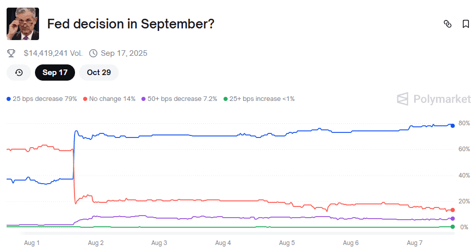 - Avec les cotes de réduction des taux d’intérêt américains en septembre à près de 80%, les marchés peuvent commencer à tarifier les tarifs dans BullisH Momentum tôt – bénéficiant potentiellement à BTC tout au long du mois d’août.