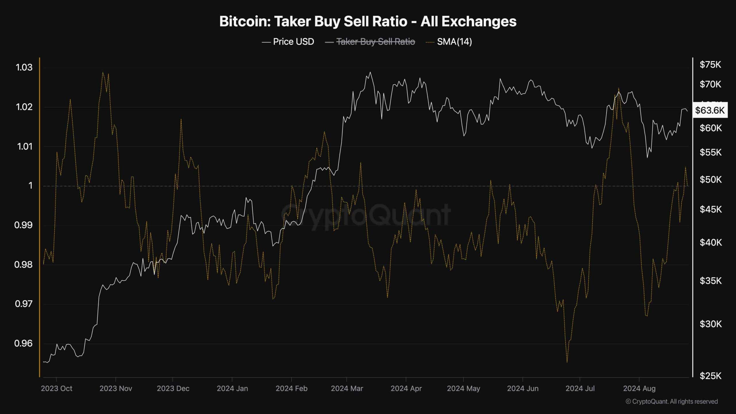 Récemment, le ratio a connu une baisse significative, indiquant une forte pression à la vente. Cependant, la mesure a depuis commencé à se redresser, affichant une légère hausse. Cela suggère que les acheteurs font des efforts pour pousser le prix du Bitcoin au-dessus du niveau de résistance critique de 63 000 $. Si cette tendance à la hausse du ratio se poursuit, la phase de retracement actuelle pourrait s’étendre à court terme, conduisant potentiellement à une cassure au-dessus des moyennes mobiles de 100 et 200 jours et ouvrant la voie à un mouvement vers la région de résistance cruciale de 70 000 $.