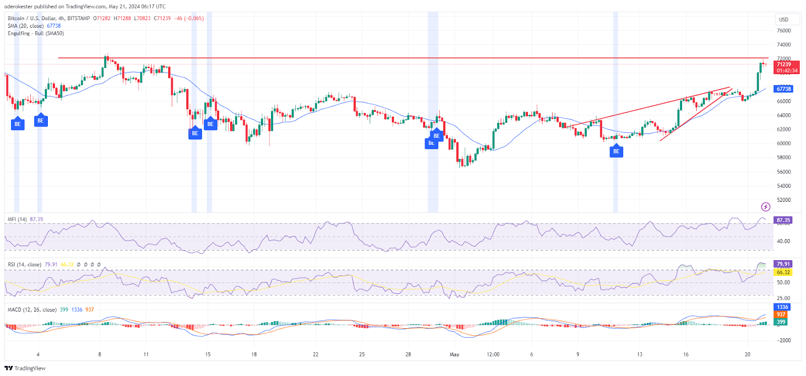 Cependant, malgré le rallye haussier, la résistance au plus haut intra-journalier de 71 946 $ a été difficile à franchir. Malgré cela, au moment de mettre sous presse, BTC était haussier, s'échangeant à 71 061 $, soit une hausse de 5,89 % par rapport au plus bas intrajournalier de 66 319 $. Parallèlement, le sentiment positif s'est manifesté dans la capitalisation boursière et le volume des transactions qui ont grimpé respectivement de 5,86 % et 135 %, à 1 400 852 056 633 $ et 51 363 824 061 $.