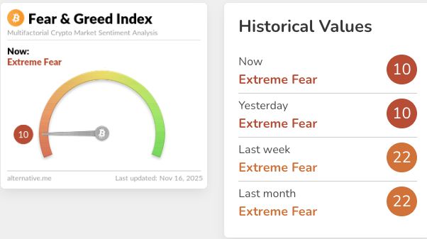 Notamment, les perspectives baissières surviennent alors que le marché de la cryptographie reste profondément en territoire d’aversion au risque, avec l’indice Bitcoin Fear & Greed plongeant fermement à 10. La lecture est restée stable, mettant en évidence une détérioration du sentiment sur un mois ; il y a à peine une semaine, l’indice se situait à 22 et signalait déjà une prudence accrue.