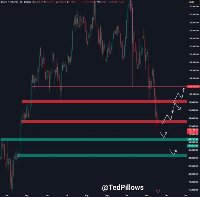 Selon l’analyste Ted Pillows, la baisse a poussé BTC directement dans une région de support critique comprise entre 88 000 et 90 000 dollars, qu’il considère comme une zone potentielle de balayage des liquidités.