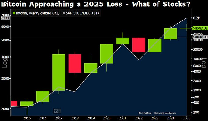 Les idées de McGlone sont en outre étayées par des données à long terme montrant que la bougie annuelle de Bitcoin pour 2025 se dirige vers sa première clôture annuelle négative depuis le ralentissement de 2022, un contraste avec le fort rebond observé en 2023 et 2024.
