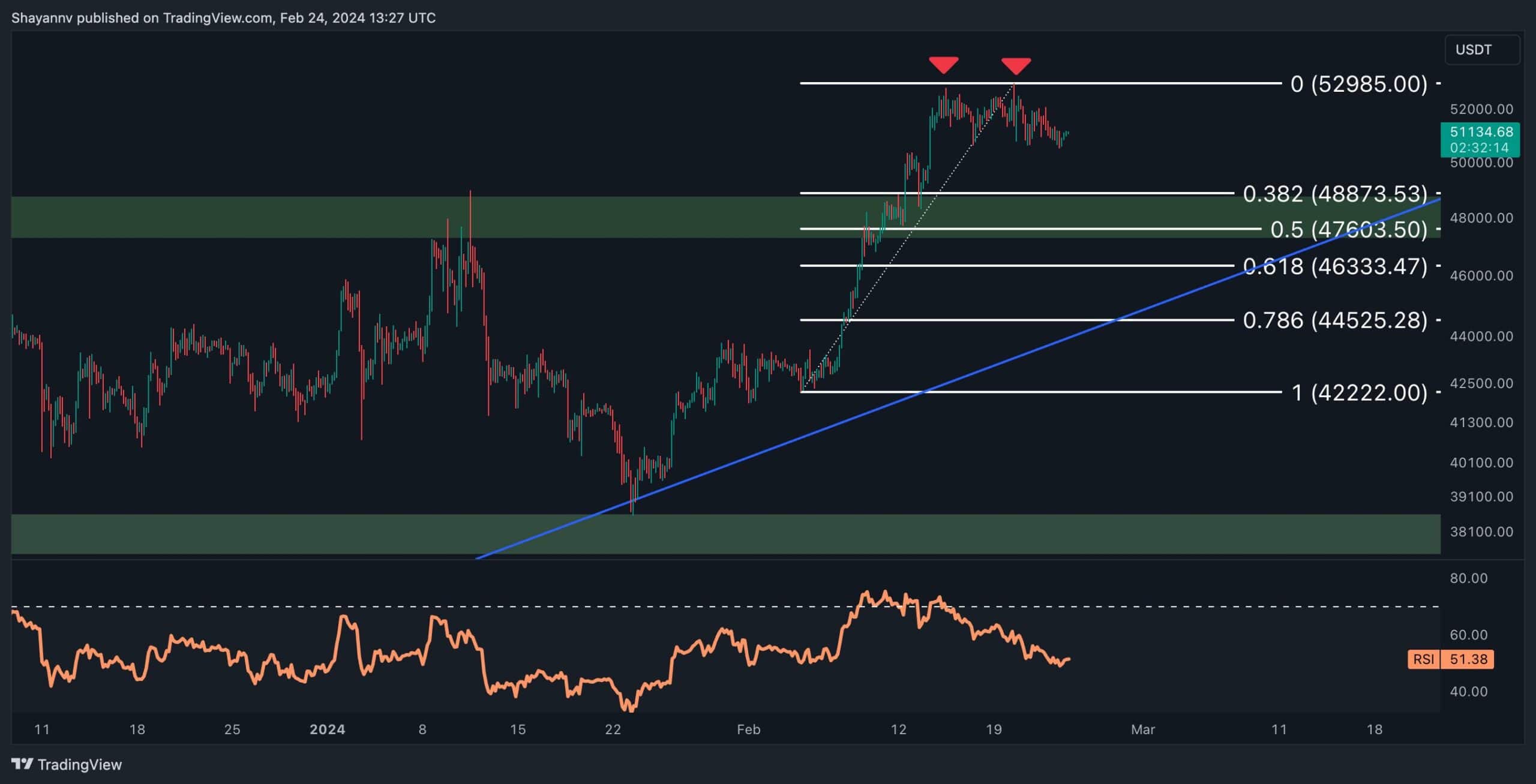 Malgré ce sentiment haussier, Bitcoin a rencontré une zone de résistance critique proche de la barre des 52 000 $ après sa récente hausse.