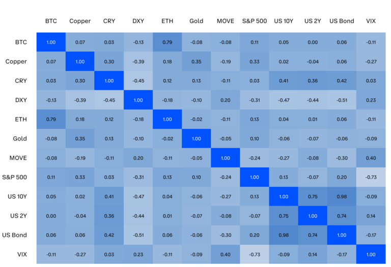Le Bitcoin est négativement corrélé à l’indice DXY et à l’or, tandis que sa corrélation avec le S&P 500 était faible à 0,11. Cela suggère que les mouvements de prix du Bitcoin sont largement indépendants des marchés traditionnels.