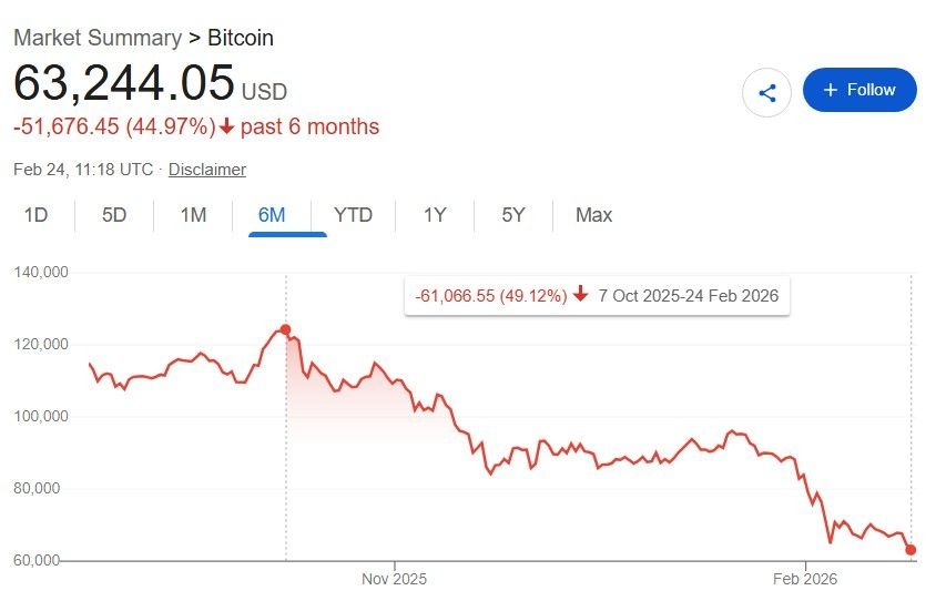 Bien que la majeure partie de 2025 ait été caractérisée par un fort marché haussier pour les crypto-monnaies et que Bitcoin ait atteint un nouveau sommet historique (ATH) au-dessus de 125 000 $ début octobre, les échanges depuis ont été à la baisse, et $BTC lui-même s’est effondré d’environ 50 % au moment de la publication le 24 février 2026.