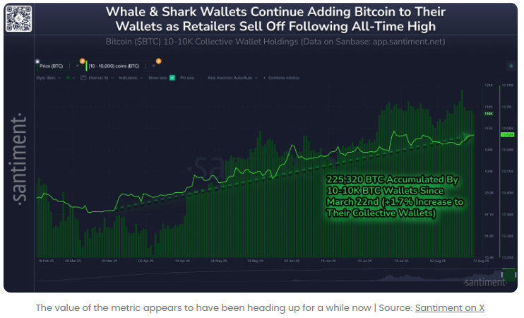 Après le fond il y a quelques jours, lorsque BTC a fixé son nouvel ATH au-dessus de 124 000 $, cependant, la métrique a trouvé un renversement, suggérant que les requins et les baleines ont acheté pendant le rabattement des prix qui a suivi.