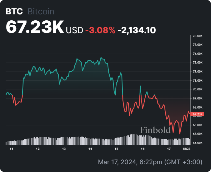 Au moment de mettre sous presse, Bitcoin s’échangeait à 67 287 $ avec des pertes quotidiennes de près de 1 %. Au cours des sept derniers jours, le BTC a baissé de 3 %.