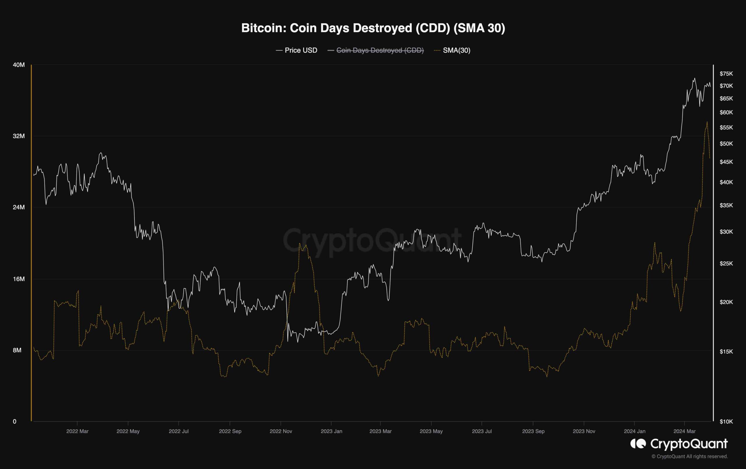 Le récent pic de Coin Days Destroyed, observé avec une moyenne mobile sur 30 jours, s'élève à 23,2 millions. Cela indique un mouvement important du Bitcoin qui était en sommeil depuis une période prolongée, rappelant les tendances observées lors des phases haussières de 2017 et 2021.
