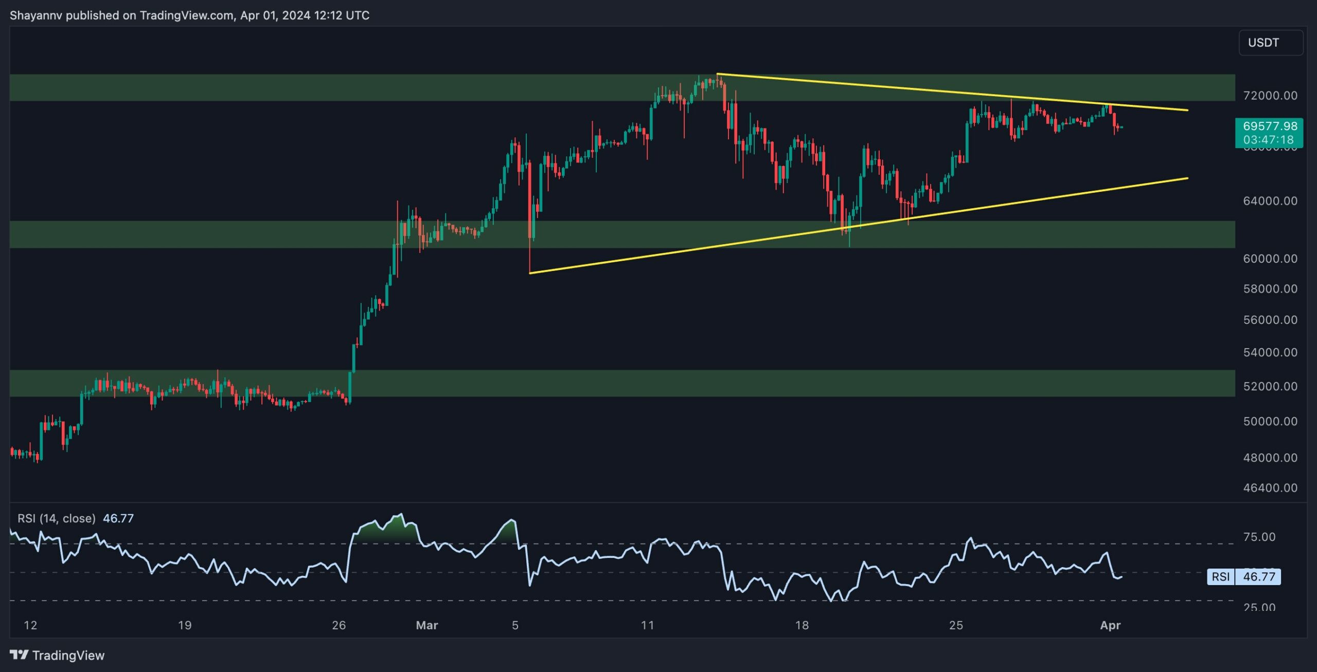 En examinant le graphique sur 4 heures, il est évident que Bitcoin a connu une demande importante à proximité de la région de support cruciale de 62 000 $, ce qui a entraîné une hausse notable des prix. Cette pression d'achat visait à propulser le prix vers le niveau de résistance de 72 000 $ en prévision de l'établissement d'un nouveau sommet historique avant l'événement de réduction de moitié.