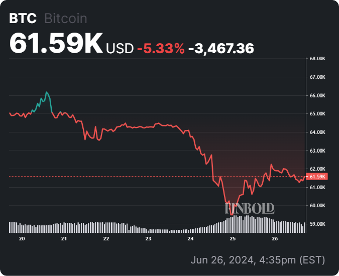 Depuis la dernière mise à jour, Bitcoin a affiché des gains marginaux de près de 1 % au cours des dernières 24 heures, s’échangeant à 61 590 $. Cependant, sur le graphique hebdomadaire, Bitcoin est revenu de son sommet au-dessus de 66 000 $, reflétant une baisse de plus de 5 % en une semaine.