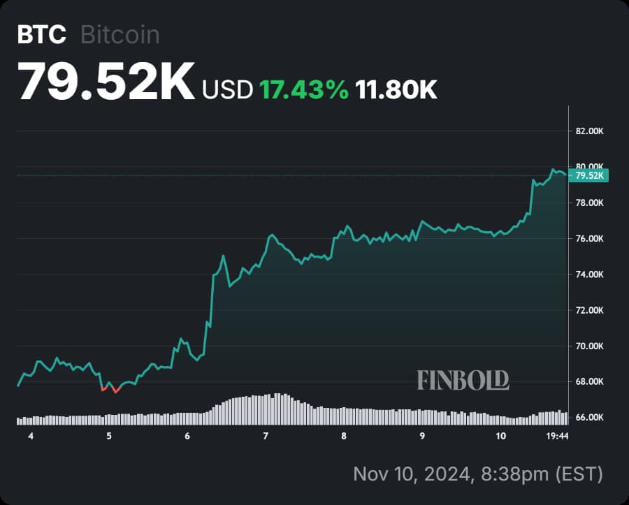 Bitcoin s’échangeait à 79 683 $ au moment de la publication, en hausse de près de 4 % au cours des dernières 24 heures.