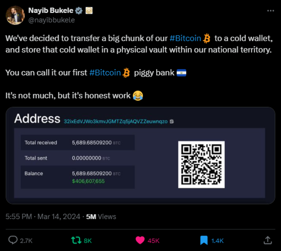 Le 14 mars 2024, le président élu du Salvador, Nayib Bukele, a dévoilé une manœuvre audacieuse historique qui a fait écho dans tout le monde du Bitcoin : le Salvador a confirmé le transfert d’une partie substantielle de ses avoirs en Bitcoin dans un entrepôt frigorifique, conservé en toute sécurité dans un coffre-fort. ses frontières nationales. Cette décision stratégique marque un tournant décisif dans l’aventure Bitcoin au Salvador depuis l’introduction de la loi Bitcoin, qui a suscité à la fois l’admiration et le scepticisme dans le monde entier.