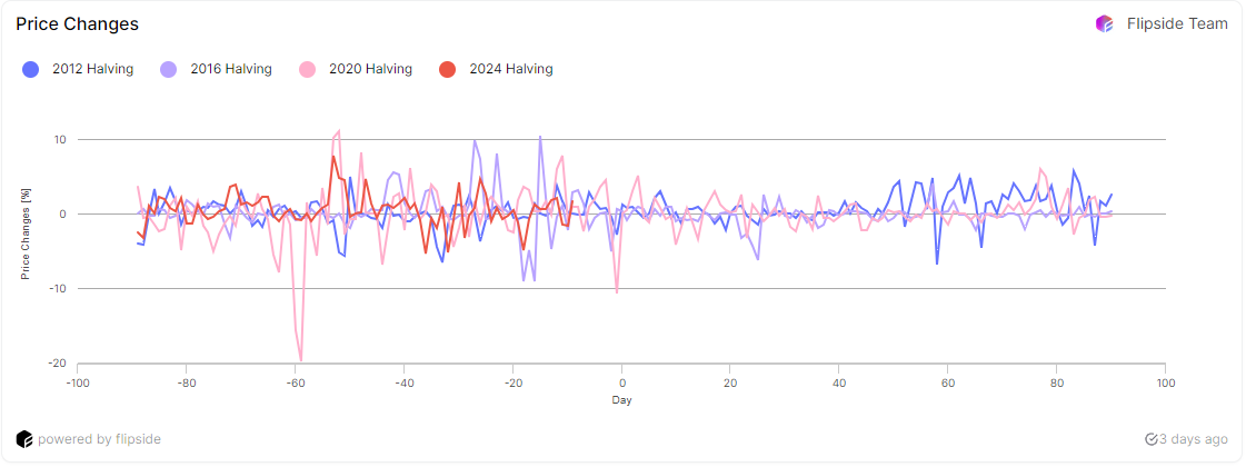 Avant la réduction de moitié de 2024, le BTC a présenté des fluctuations de prix plus faibles par rapport à chaque hausse depuis 2012, avec un écart type de 2,2 (contre 4,3 en 2020 et 2,9 en 2016).