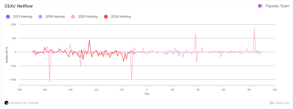 Tout cela pour dire que le fait que les flux nets de BTC vers et depuis les bourses n’ont pas été excessivement asymétriques d’une manière ou d’une autre, par rapport aux cycles passés, indique un sentiment plus équilibré et modéré des investisseurs à l’approche de la prochaine réduction de moitié.