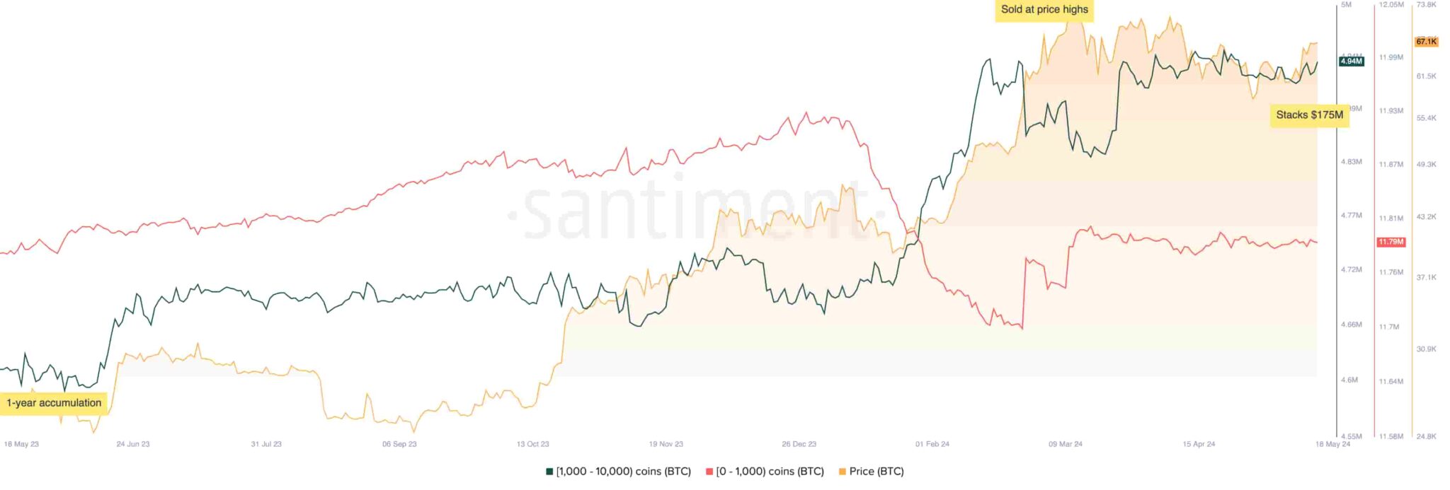 Comme observé, les adresses Bitcoin détenant entre 1 000 et 10 000 BTC ont accumulé de manière agressive près de 5 millions de pièces. Il convient de noter le croisement d’adresses avec moins de 1 000 BTC quelques mois avant que Bitcoin n’atteigne de nouveaux sommets historiques : les baleines accumulaient davantage, tandis que le commerce de détail vendait de manière agressive.