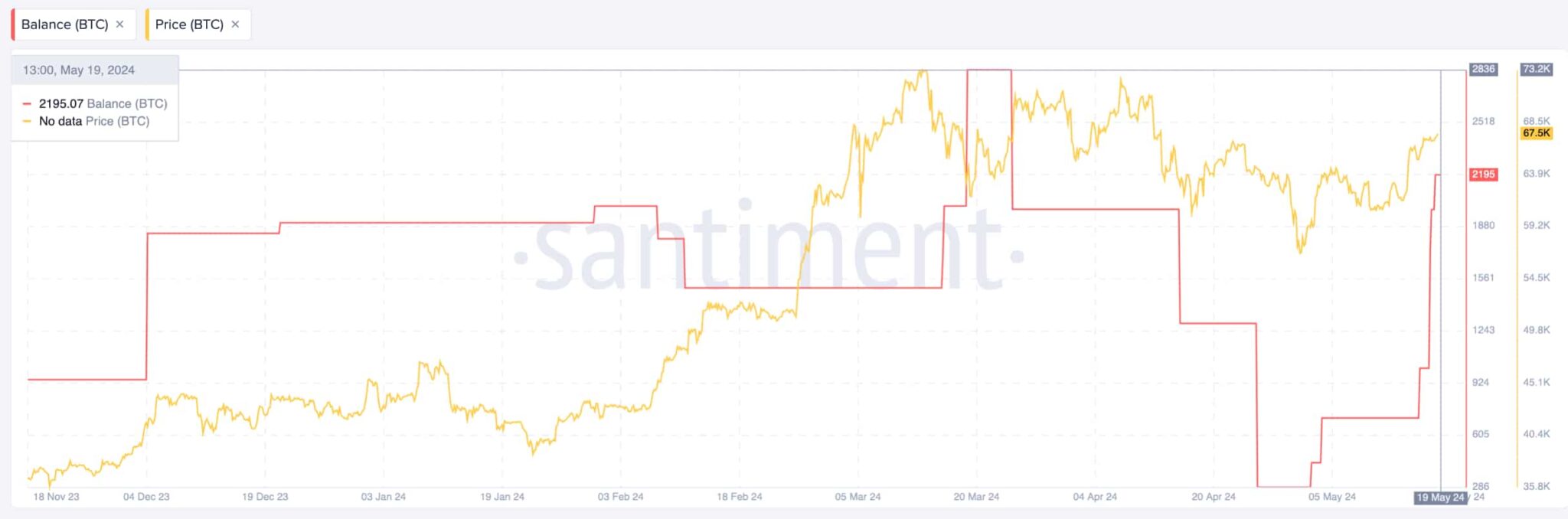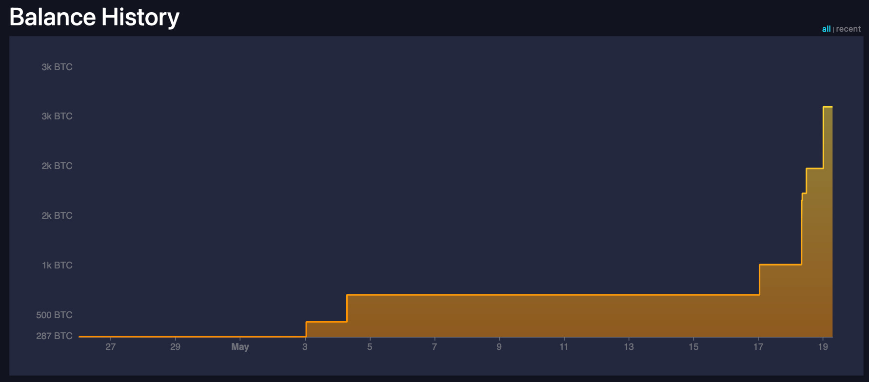 Depuis le 18 mai, ce trader a acheté 1 590 BTC, s'ajoutant à un solde déjà croissant de 1 014 BTC au 17 mai. Avant mai, son solde de 287 BTC valait moins de 20 millions de dollars, et se trouve désormais dans une pile de près de 175 millions de dollars.