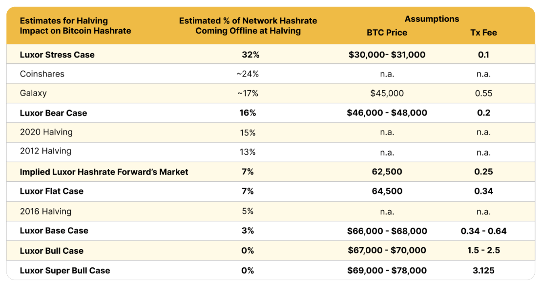 Après tout, ce sont eux qui maintiendront la difficulté du minage de Bitcoin élevée. Ceux qui ne peuvent pas rivaliser quitteront le réseau, ce qui facilitera la tâche des concurrents car la difficulté du réseau est automatiquement ajustée. Selon le scénario de base de Louxor, dans le scénario où le prix du BTC reste dans la fourchette de 66 000 $ à 66 000 $, 3 % des mineurs de Bitcoin pourraient quitter le réseau.