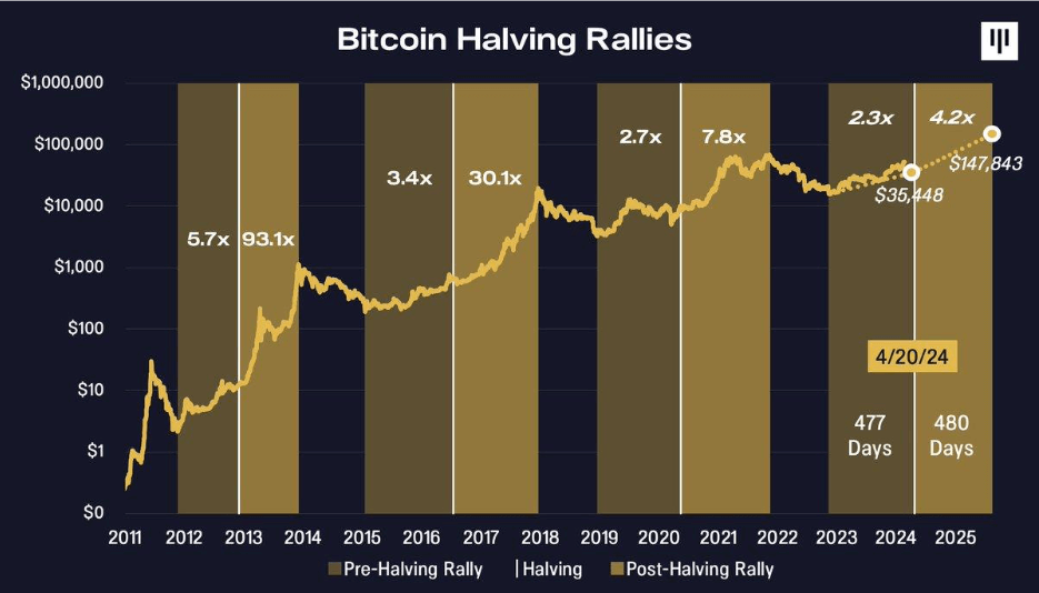 Et à mesure que l’adoption du Bitcoin augmentait, le réseau minier Bitcoin est devenu plus sécurisé. En effet, de plus en plus de mineurs de Bitcoin augmentent la difficulté du minage de Bitcoin, qui est automatiquement ajustée toutes les deux semaines. Suite au remaniement de la dynamique de l’offre et de la demande, les réductions de moitié du Bitcoin entraînent généralement de multiples gains avant et après la réduction de moitié.