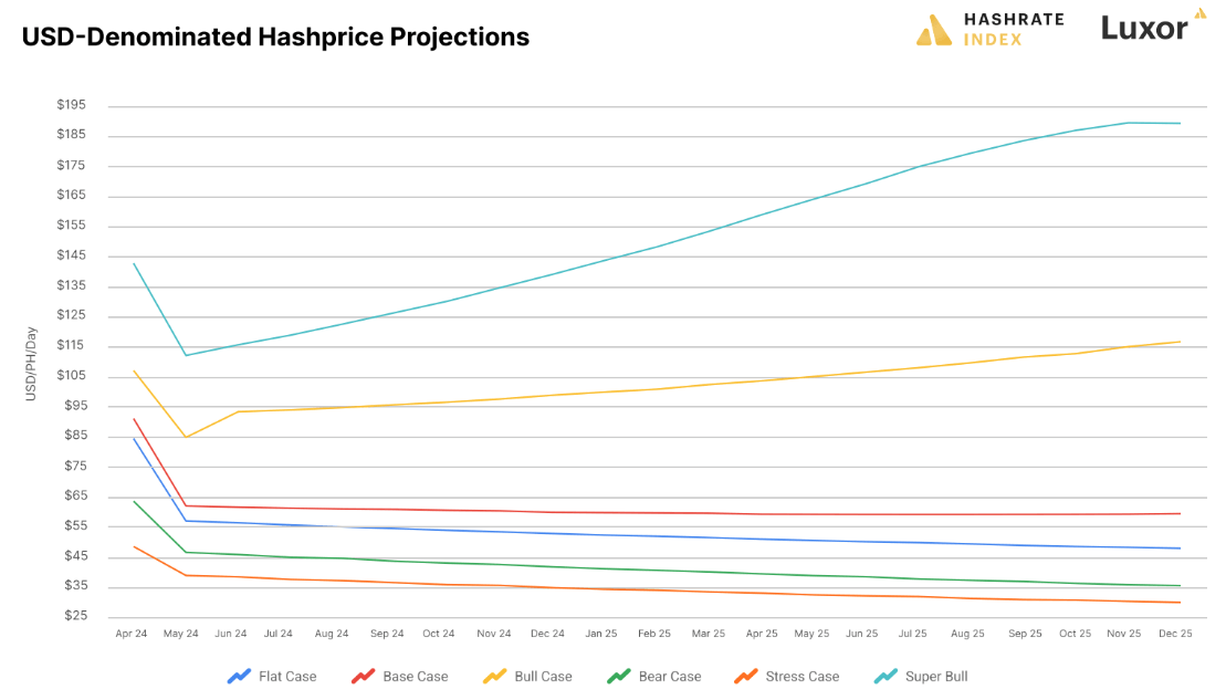 En outre, Projets de Louxor Difficulté du Bitcoin pour atteindre 725 EH/s d’ici la fin de l’année. Cela stabiliserait le prix de hachage après la réduction de moitié à 53 $/PH/jour, ce qui s'alignerait sur la projection du prix de hachage du cas plat.