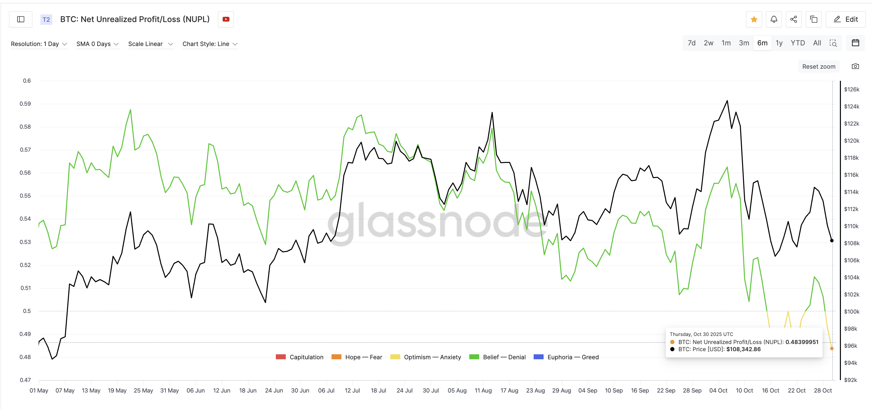 Ce point de vue est étayé par la mesure des profits/pertes nets non réalisés (NUPL) de Glassnode, qui montre la proportion d’investisseurs dans les profits ou les pertes. Il est désormais tombé à 0,483, l’un de ses niveaux les plus bas en six mois. De tels niveaux apparaissent généralement lorsque les traders les plus faibles sortent et que les mains les plus fortes tiennent bon. Une baisse du NUPL signifie également une faible incitation à vendre ou à réaliser des bénéfices.