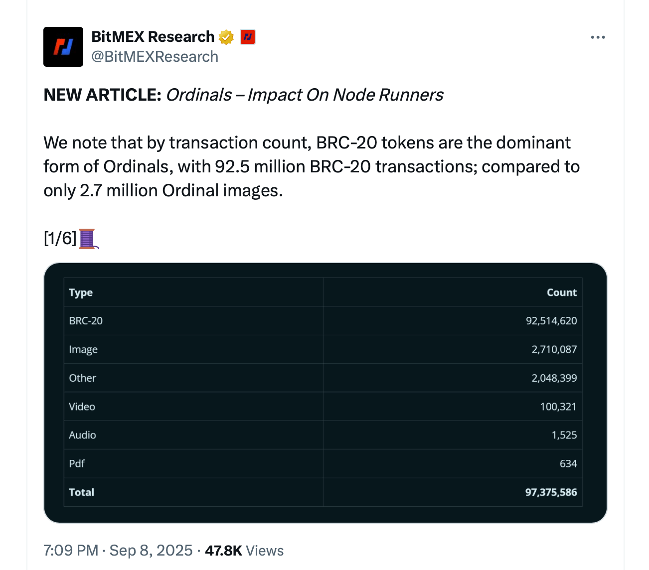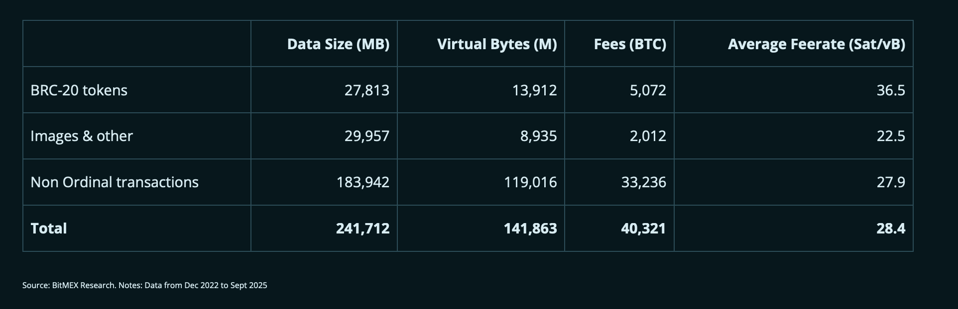 La recherche Bitmex dépend d’environ 97,4 millions d’inscriptions ordinales depuis la fin 2022, dont environ 92,5 millions d’événements BRC-20 et 2,7 millions d’images. Malgré l’écart de nombre, les chercheurs trouvent que les données d’image occupent environ 30,0 Go d’onChain contre 27,8 Go pour BRC-20, tandis que les images utilisent moins d’unités de poids en raison de la remise des témoins.