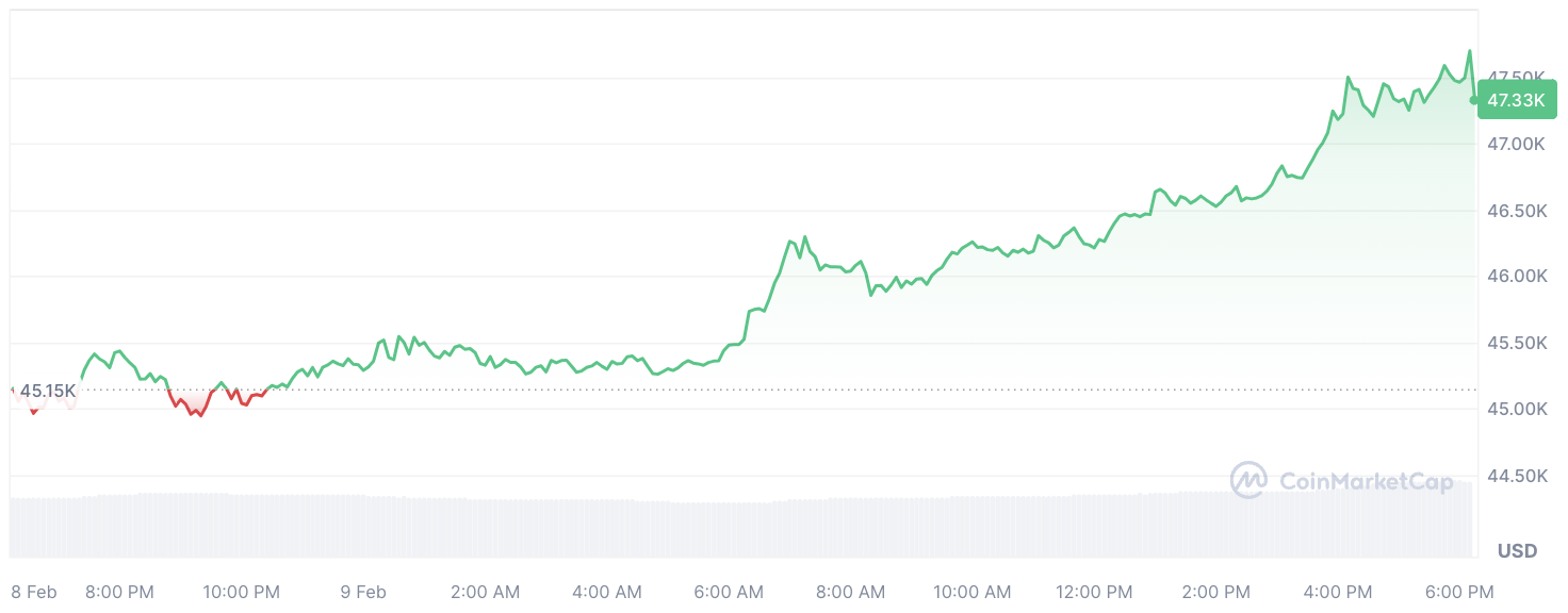 Dans le même temps, la performance du marché du BTC reflète cet intérêt accru des investisseurs, avec des prix en hausse de plus de 5,7 % aujourd’hui, atteignant des sommets locaux à 47 650 $.