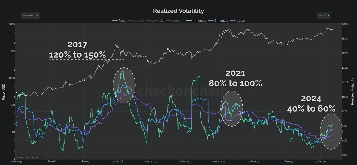 Un aspect frappant de l’analyse de Check est la transformation du profil de volatilité du Bitcoin. « Le profil global de volatilité réalisé pour Bitcoin est la moitié de ce qu'il était en 2021 et 3 fois plus petit qu'en 2017 », déclare Check. Cette tendance indique une maturité croissante au sein du marché du Bitcoin, reflétant son évolution vers un actif plus stable au fil du temps par rapport à ses premières années.