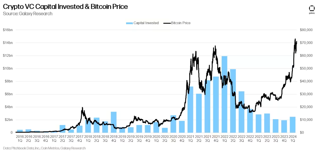 Selon Galaxie rapportau premier trimestre 2024, les investisseurs en capital-risque ont injecté 2,49 milliards de dollars dans des entreprises axées sur la cryptographie et la blockchain par le biais de 603 transactions, marquant une augmentation de 29 % d'un trimestre à l'autre du montant du financement et une augmentation de 68 % du nombre de transactions.
