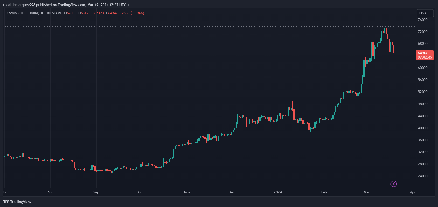 Bitcoin a subi une baisse de 14 % depuis qu’il a atteint son niveau record (ATH) de 73 700 $ la semaine dernière, touchant brièvement 62 483 $ mardi matin. Cependant, il s’est redressé et s’est stabilisé autour de 64 900 $, juste en dessous de la barre des 65 000 $.