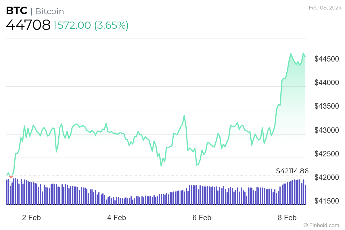 Dans l’état actuel des choses, le prix du Bitcoin s’élève actuellement à 44 708 $, ce qui indique une augmentation de 3,65 % au cours des dernières 24 heures, ainsi qu’un gain de 6 % au cours des sept jours précédents, alors que, sur son graphique mensuel, il enregistre un baisse de 4,06%, selon les données du 8 février.