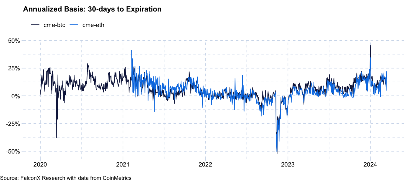 Selon Lawant, l’un des meilleurs moyens d’évaluer l’adoption par les grands investisseurs institutionnels basés aux États-Unis est de comparer les intérêts ouverts avec la base – qui est la différence entre les prix à terme et les prix au comptant – du Chicago Mercantile Exchange (CME).