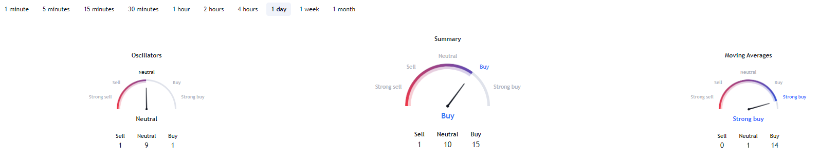 Ailleurs, l'analyse technique de Bitcoin est dominée par des sentiments haussiers. Selon les données extraites d'un résumé des jauges journalières de Bitcoin, elles indiquent un « achat » à 15, tandis que les moyennes mobiles sont à un « achat fort » à 14. Les oscillateurs, en revanche, sont « neutres » à 9.