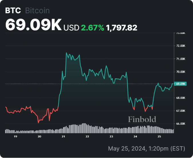 Au moment de mettre sous presse, Bitcoin s'échangeait à 69 103 $ avec des gains quotidiens de près de 2,5 %. Sur le graphique hebdomadaire, BTC est en hausse de 2,67 %.
