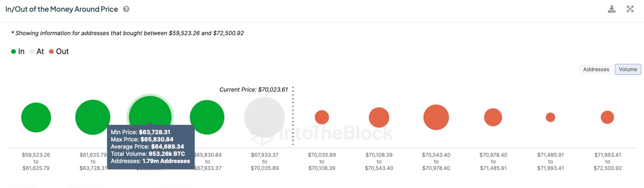 En particulier, la mesure « In/Out of the Money Around Price » montre un fort soutien à des prix inférieurs aux prix actuels. Le volume le plus important se situe entre 63 728 et 65 830 dollars, avec une moyenne de 64 689 dollars. 1,79 million d'adresses ont acheté plus de 953 260 BTC à ces prix et sont actuellement bénéficiaires.