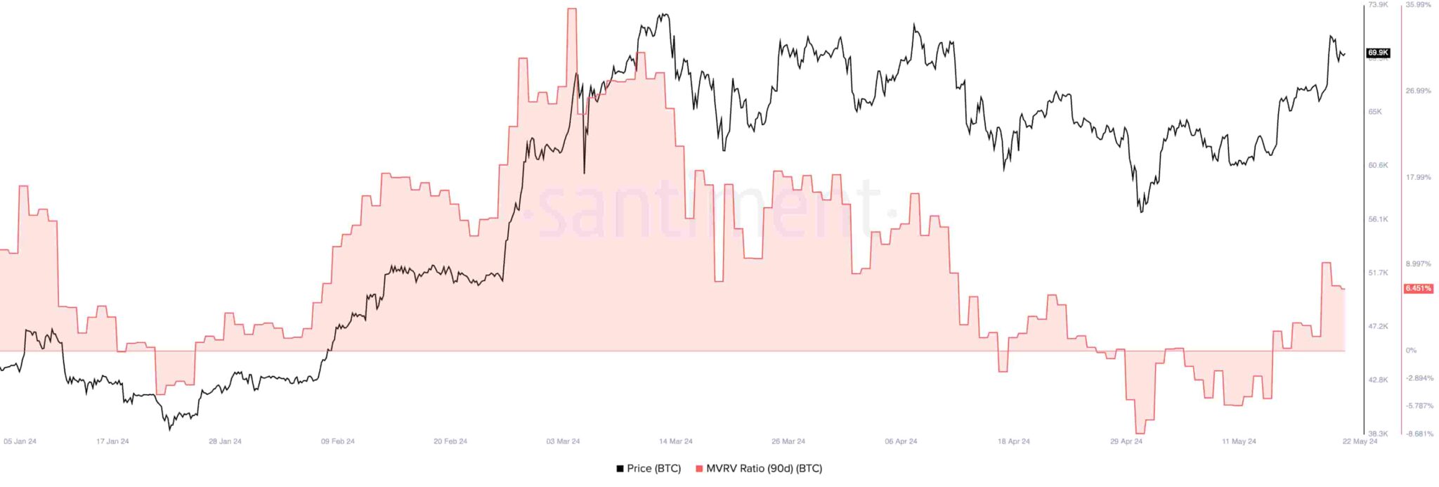 Au moment d'écrire ces lignes, le ratio MVRV à 90 jours de 6 % suggère une perspective neutre, avec une faible résistance à 70 000 $. Néanmoins, ces prix ont un ratio proportionnellement faible par rapport aux 35% observés en mars.