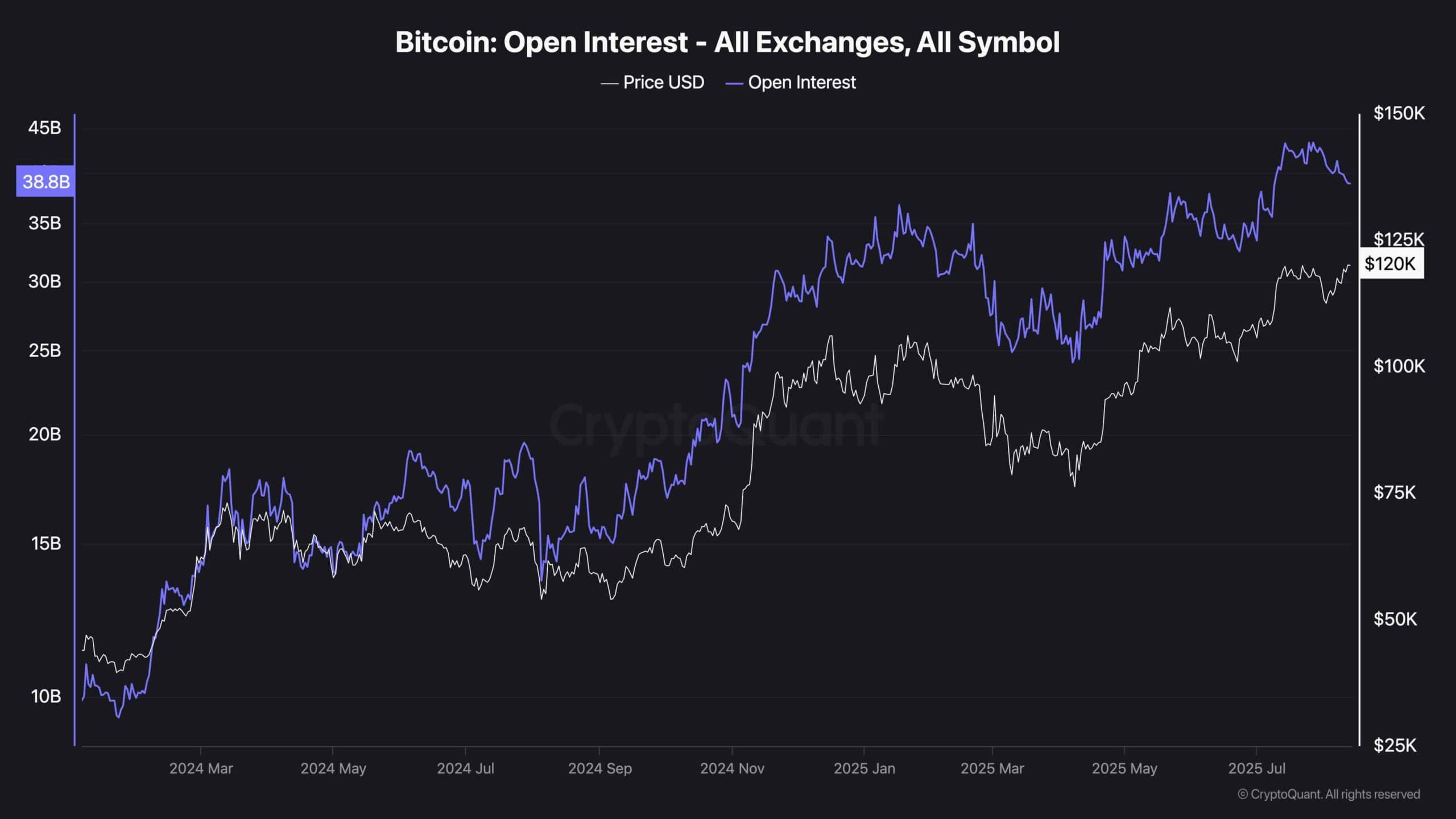 L’intérêt ouvert (OI) est une métrique clé sur les marchés des dérivés qui reflète le nombre total de contrats à terme et d’options en cours. En règle générale, lorsque le prix de Bitcoin augmente, les intérêts ouverts augmentent également à mesure que de plus en plus de commerçants ouvrent des positions longues, s’attendant à ce que le rassemblement se poursuive. Ce comportement est souvent motivé par la participation croissante du marché, l’augmentation du levier et le sentiment global haussier.