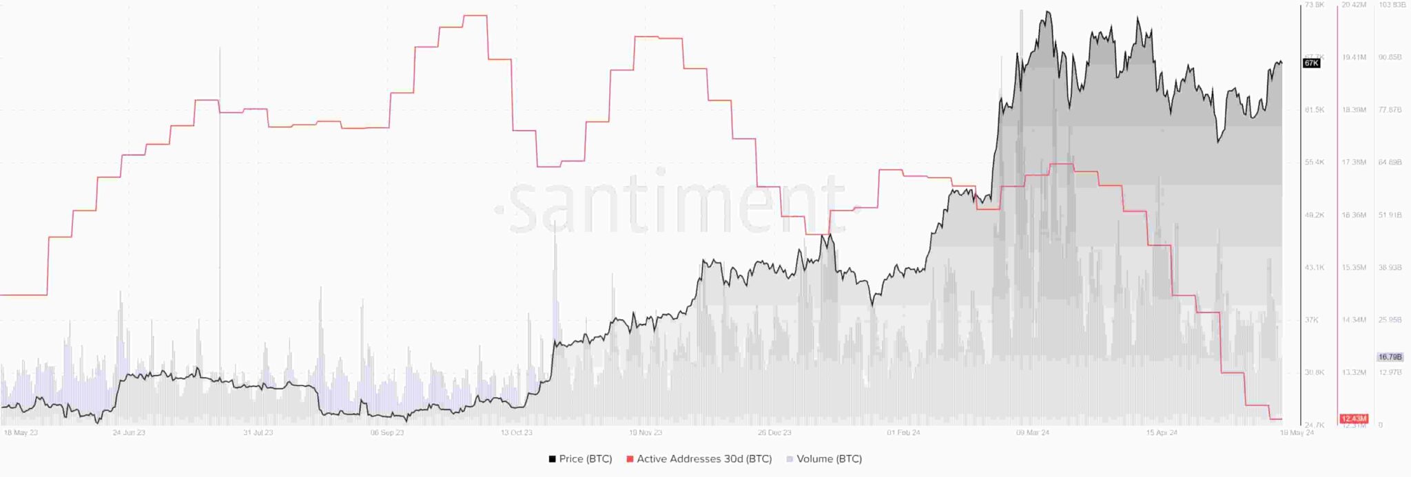 La baisse de l'activité du réseau, indiquée par un creux pluriannuel du nombre d'adresses actives sur 30 jours, suggère une demande réduite pour les transactions Bitcoin. Cette mesure, qui suit les adresses distinctes participant aux transactions sur 30 jours, est tombée à 12,64 millions, un niveau observé pour la dernière fois en février 2019.