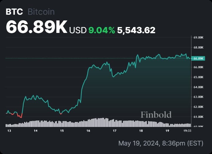 Au moment de mettre sous presse, Bitcoin s'échangeait à 66 897 $ avec un gain quotidien de 0,27 %, tandis que sur le graphique hebdomadaire, BTC est en hausse de près de 10 %.