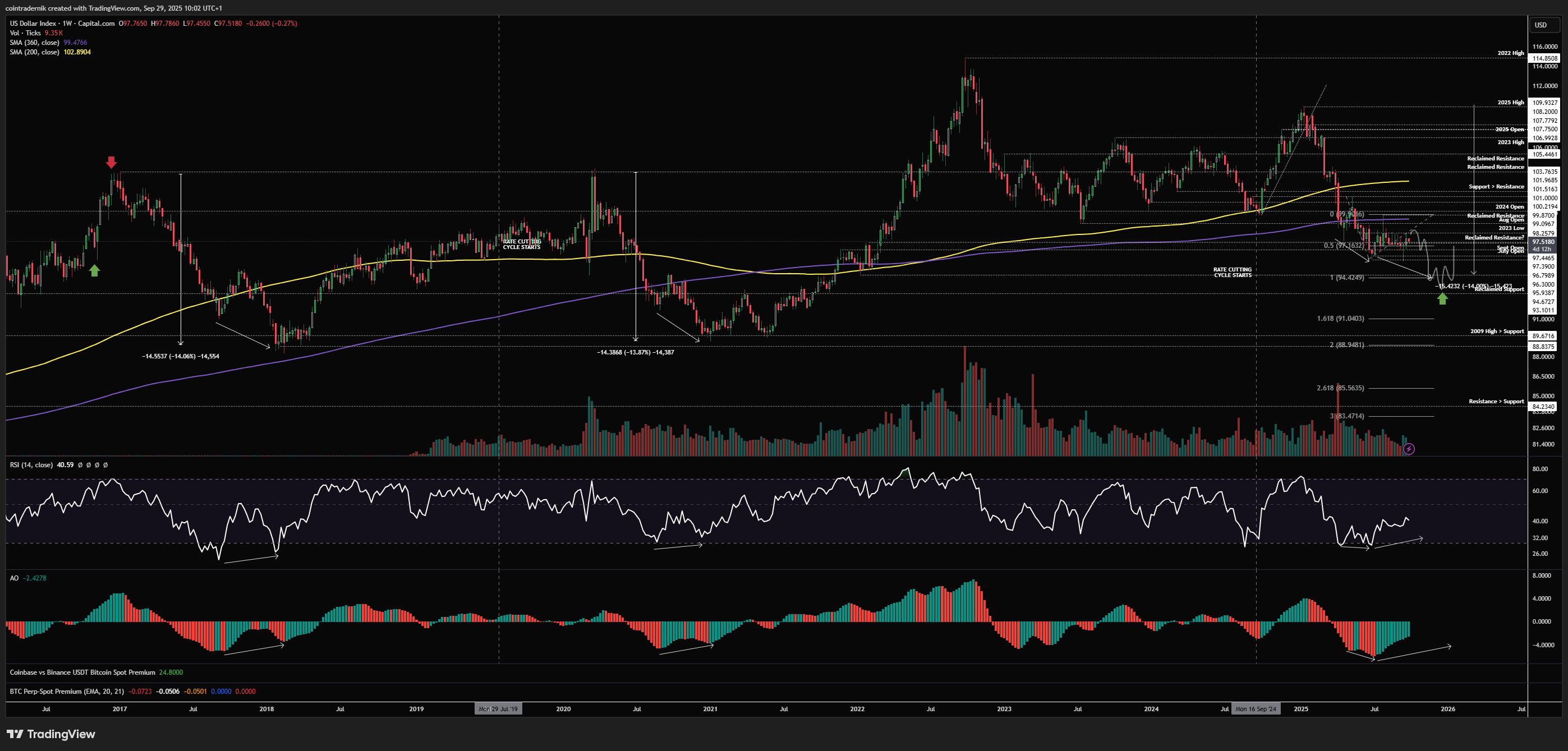 La macro complique une image technique autrement ordonnée. Patel s’attend à ce que le dollar se reproduise avant de retourner, une séquence qui soutiendrait le risque plus tard dans le quatrième trimestre: l’offre post-FOMC de la semaine dernière est «de courte durée», avec DXY «99 comme le plus élevé que j’attends», et un plus grand mouvement vers 93 au quatrième trimestre si le moment est en panne sous l’ouverture de septembre. Sur les actions, il prévoit que «un peu plus hachisque» que la crypto, mais encadrent toujours des plongettes comme des opportunités jusqu’à la fin de l’année.