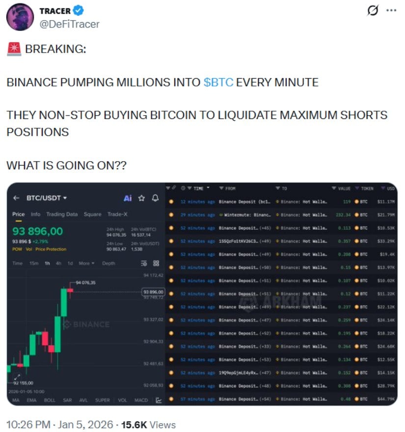 Binance prévoit des afflux massifs de BTC alors que les achats en liquidation à découvert stimulent la dynamique du marché. Source : @DeFiTracer via X