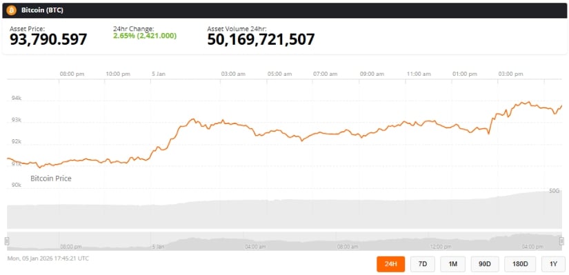 Au moment de mettre sous presse, le Bitcoin s’échangeait à environ 93 790, en hausse de 2,65 % au cours des dernières 24 heures. Source : prix du Bitcoin via Brave New Coin