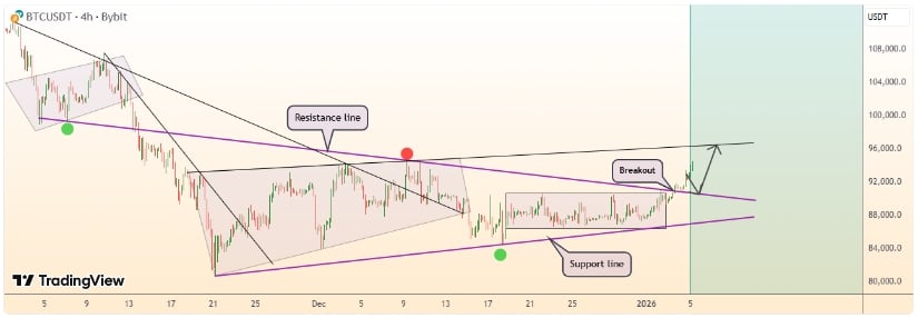 BTC sort d’un triangle symétrique, ciblant 95 000 $ à 98 000 $ avec un support de 90 000 $ à 92 000 $, soutenu par la demande institutionnelle et les afflux d’ETF. Source : DeGRAM TradingView