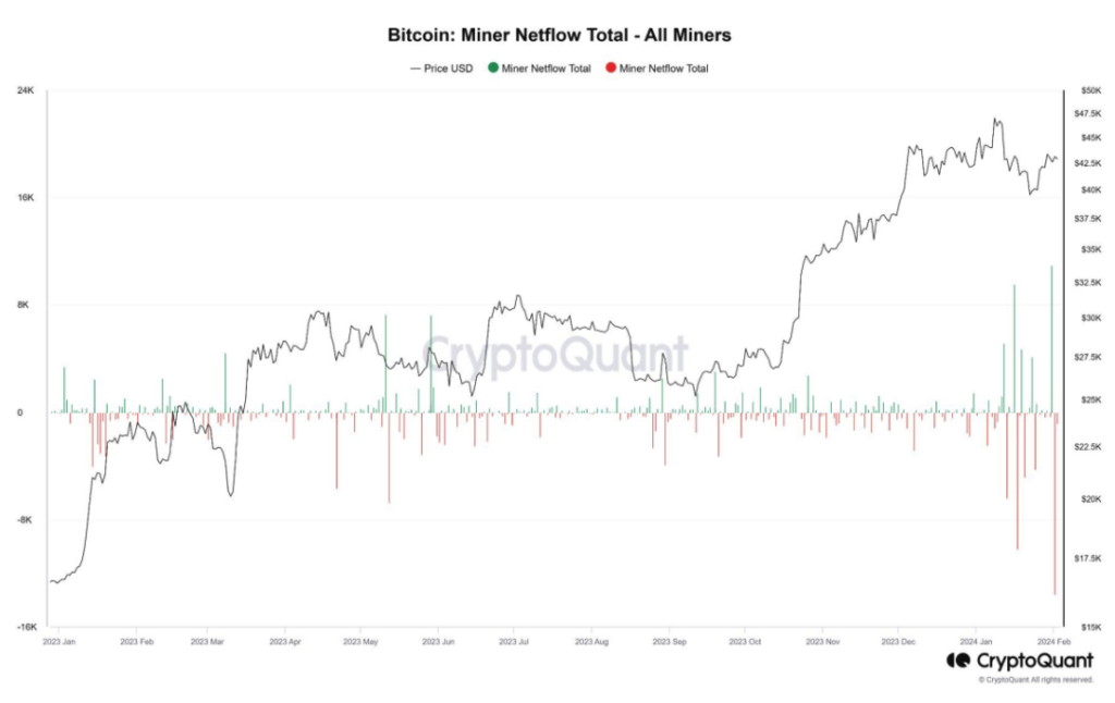 Au 16 février, GBTC détenait 456 033 bitcoins, soit quatre fois plus que tous les ETF Bitcoin réunis. En plus de cette pression de vente encore résolue, les mineurs se préparent à la réduction de moitié du Bitcoin après la quatrième division en vendant du BTC pour réinvestir. Selon Bitfinex, cela a entraîné des sorties d’une valeur de 10 200 BTC.