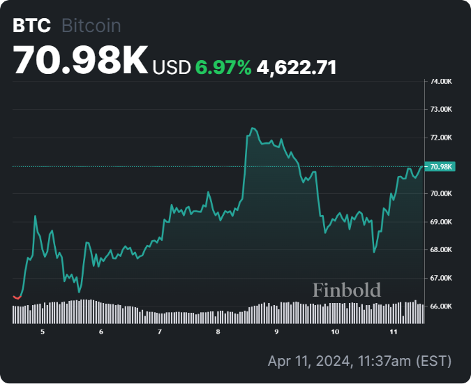Au moment de mettre sous presse, le prix du Bitcoin s'échangeait aujourd'hui à 70 977 $, reflétant une hausse notable de plus de 3 % au cours des dernières 24 heures. Sur le graphique hebdomadaire, BTC a connu une hausse de près de 7 %.