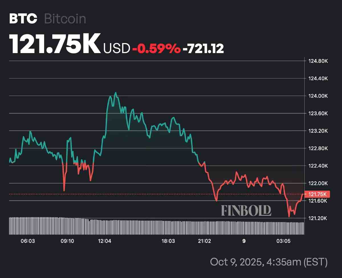 Au moment de la rédaction de cet article, Bitcoin se négocie à environ 121 750 $, en baisse de 0,59 % sur la journée. Si le RSI ou le CMO s’aplatit ou baisse alors que le prix reste le même ou augmente, une divergence baissière deviendrait probable.