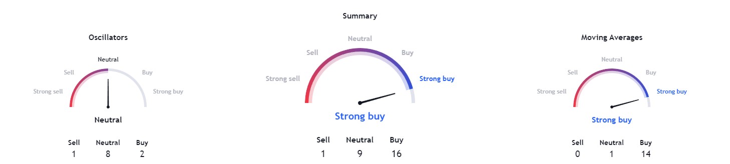 Après un examen plus approfondi des indicateurs techniques, nous observons une note « achat fort » de 16, indiquant un sentiment favorable. Désormais à 14, les moyennes mobiles tendent également vers un « achat fort ». Cependant, les oscillateurs indiquent actuellement une note « neutre » de 8.
