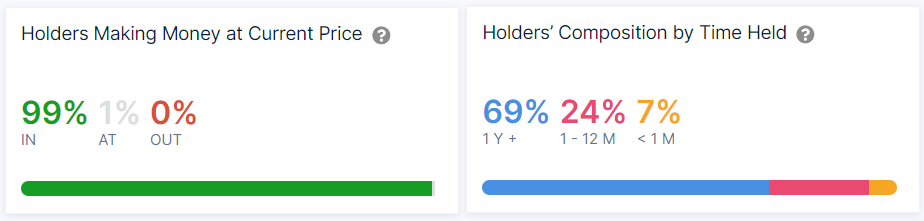 En plus de cela, les données les plus récentes de la plateforme d’information sur le marché DeFi montrent que jusqu’à 99 % de tous les détenteurs de Bitcoin sont actuellement en profit, avec seulement 1 % à l’argent et aucun détenteur à perte, la majorité d’entre eux ayant l’actif dans leurs portefeuilles cryptographiques pendant plus d’un an.