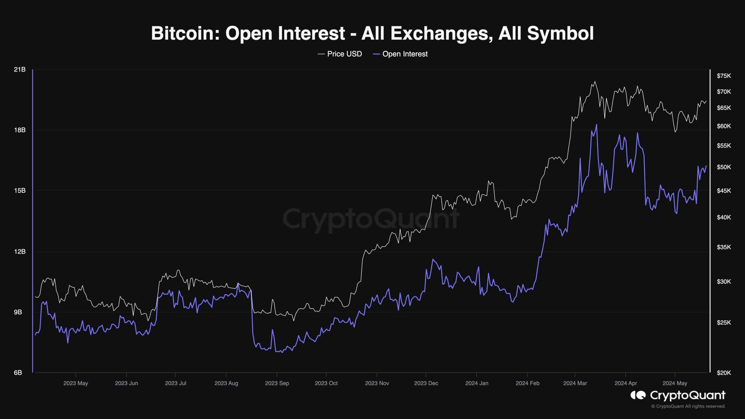 Ce graphique démontre l'intérêt ouvert du Bitcoin, l'une des mesures les plus importantes pour analyser le sentiment du marché à terme. Des valeurs plus élevées sont généralement associées à un sentiment haussier et vice versa. Cependant, des valeurs d’intérêt ouvert extrêmement élevées peuvent également conduire à des cascades de volatilité et de liquidation.