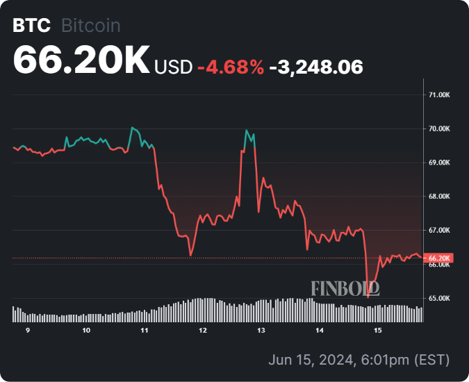 Bitcoin s'échangeait à 66 200 $ au moment de la publication, avec une correction de près de 1 % au cours des dernières 24 heures. Sur le graphique hebdomadaire, Bitcoin était en baisse de près de 5 %.